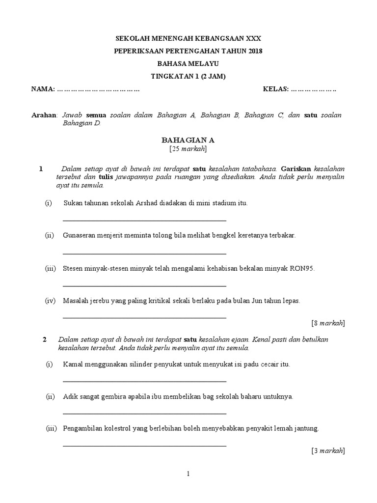 Ujian Pertengahan Tahun Bahasa Melayu Tingkatan 1satu Contoh 2 1 1 Pdf